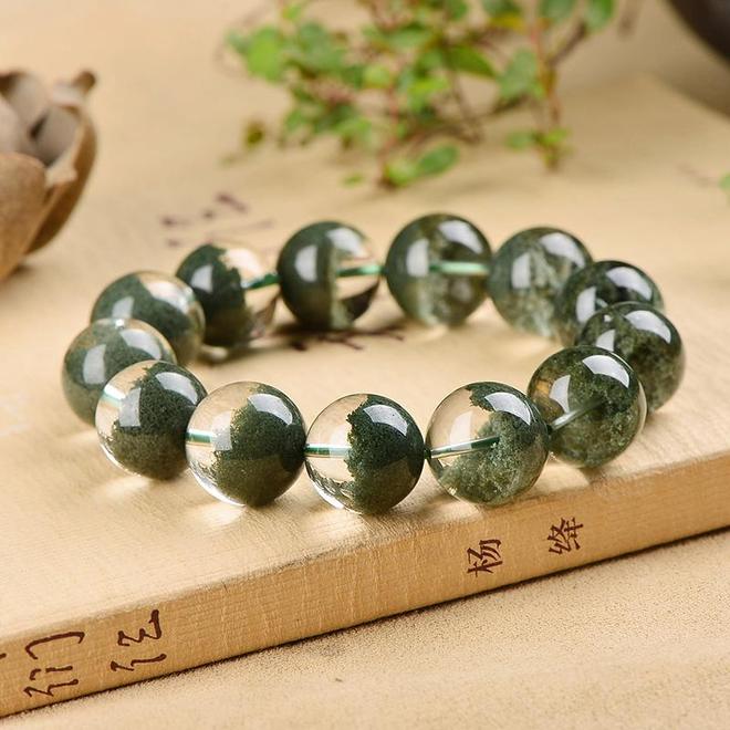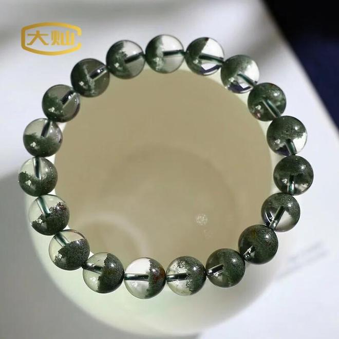 绿幽灵水晶之所以珍贵,在于其形成需要极端巧合的地质条件。当二氧化硅溶液在火山岩缝隙中缓慢结晶时,必须恰好包裹进绿泥石、白云母等层状硅酸盐矿物,才能形成内部悬浮的幽灵景观。大灿天然绿幽灵手串精选巴西米纳斯吉拉斯州矿区的老料,每颗珠子都能清晰看到如云雾、山峦或梯田般的天然包裹体,这些被行家称为聚宝盆的异象晶体,在强光下会呈现立体的景深感。尤其特别的是晶体底部自然沉积的绿色矿物质层,厚度均匀者尤为稀有,被视为招财纳福的象征。整条手链采用双股弹力绳手工穿制,15mm的珠子大小男女皆宜,佩戴时与手腕的贴合度恰到好处