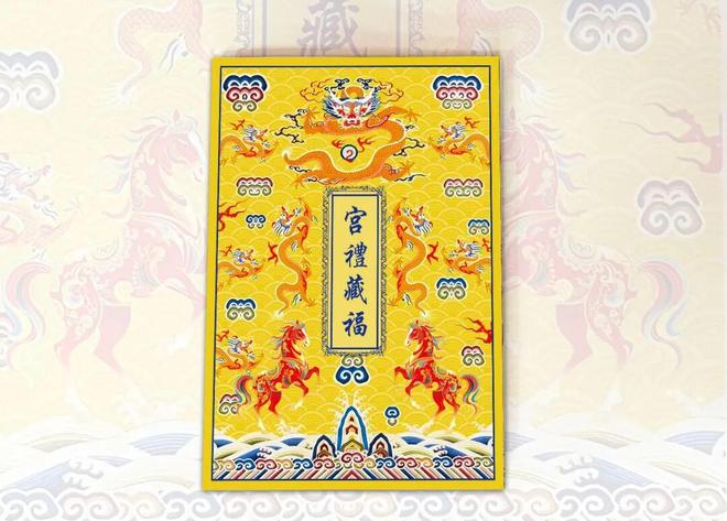 贺卡封面“宫禮藏福”四字,用故宫“通脊装”古法贴于洒金梅花笺,四周“曲水走马”回纹暗合马年。宫墙朱砂配汉瓦灰,一艳一素,庙堂气与烟火气并收——宫礼已至,福藏即开。
